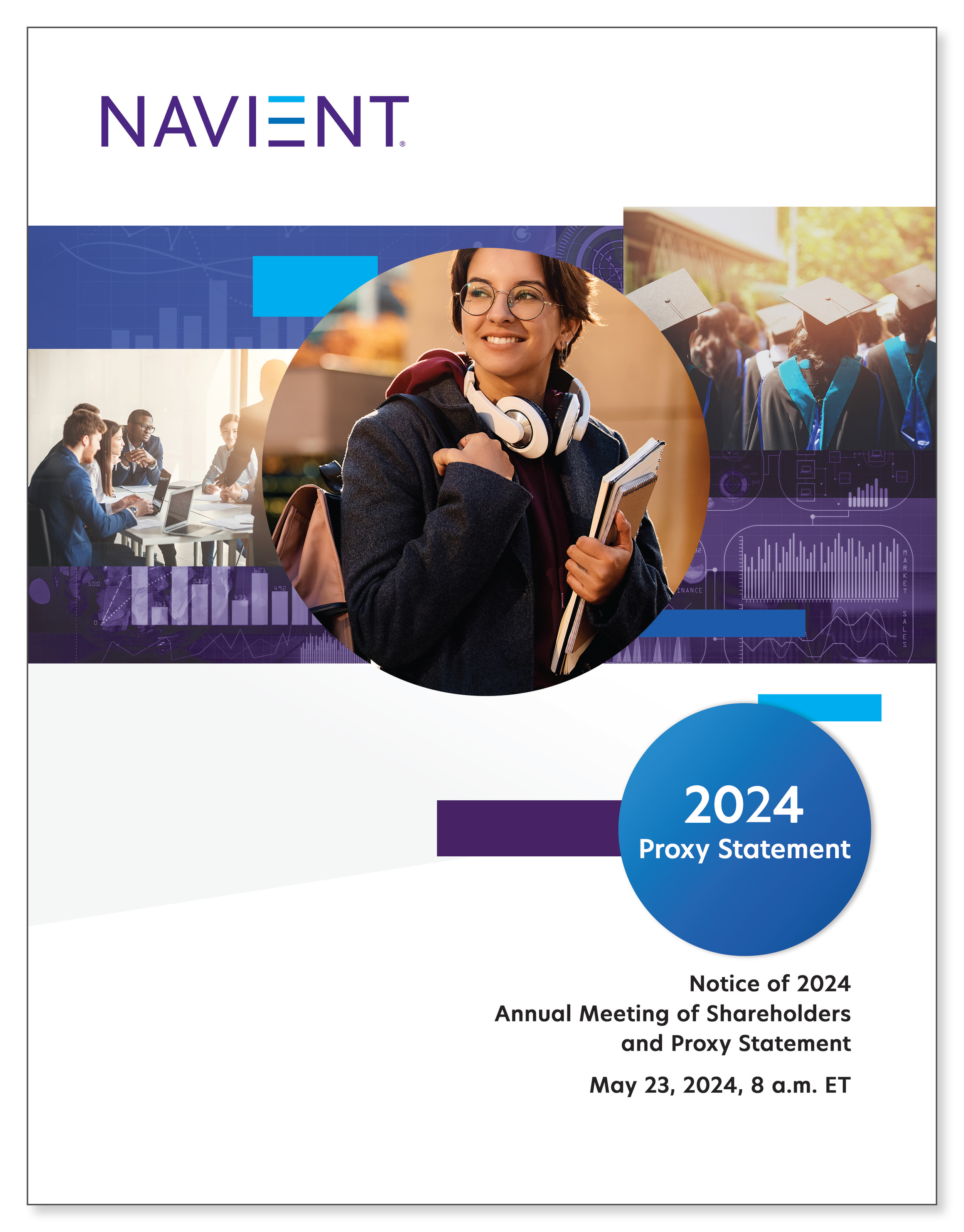Todd's design and layout of the Navient Proxy Statement cover with images of a student, a graduation ceremony, and a business meeting, featuring company logo and meeting details