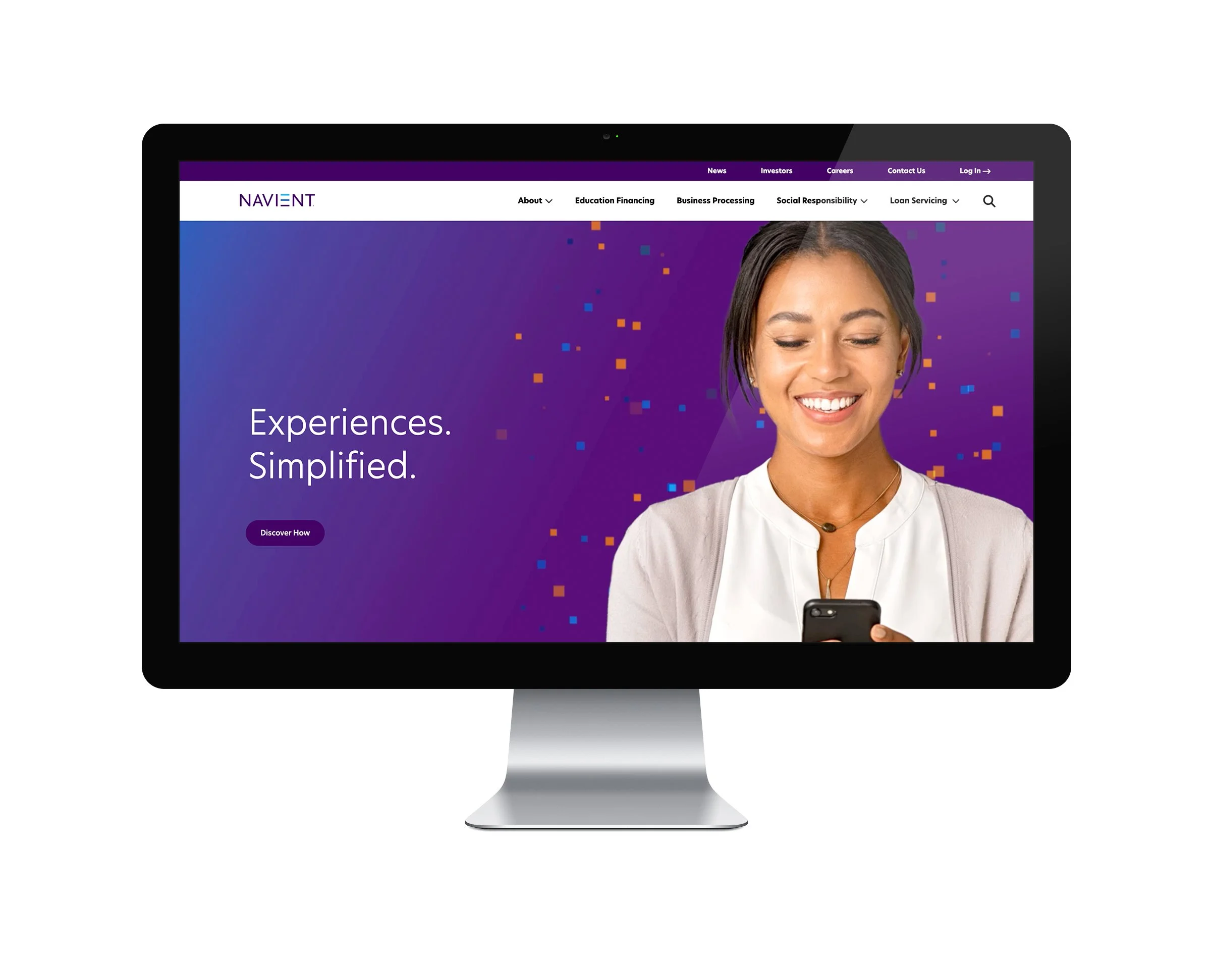 A mock-up of the Navient website homepage including an "above-the-fold" hero image with a smiling woman holding a smartphone on a purple gradient background.