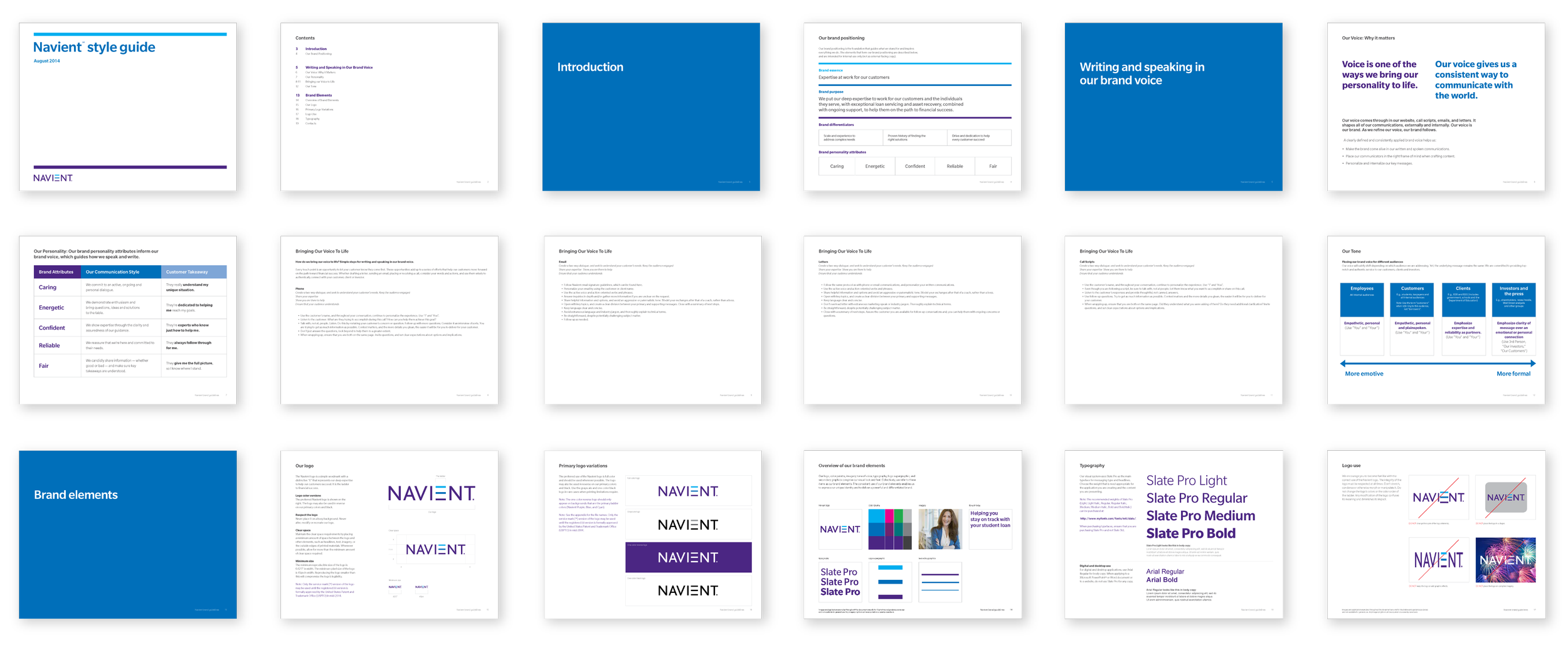 Navient style guide document pages showcasing brand guidelines. Includes sections on brand voice, communication style, logo usage, typography, and brand elements. Features colors, text styles, and diagrams illustrating branding principles.