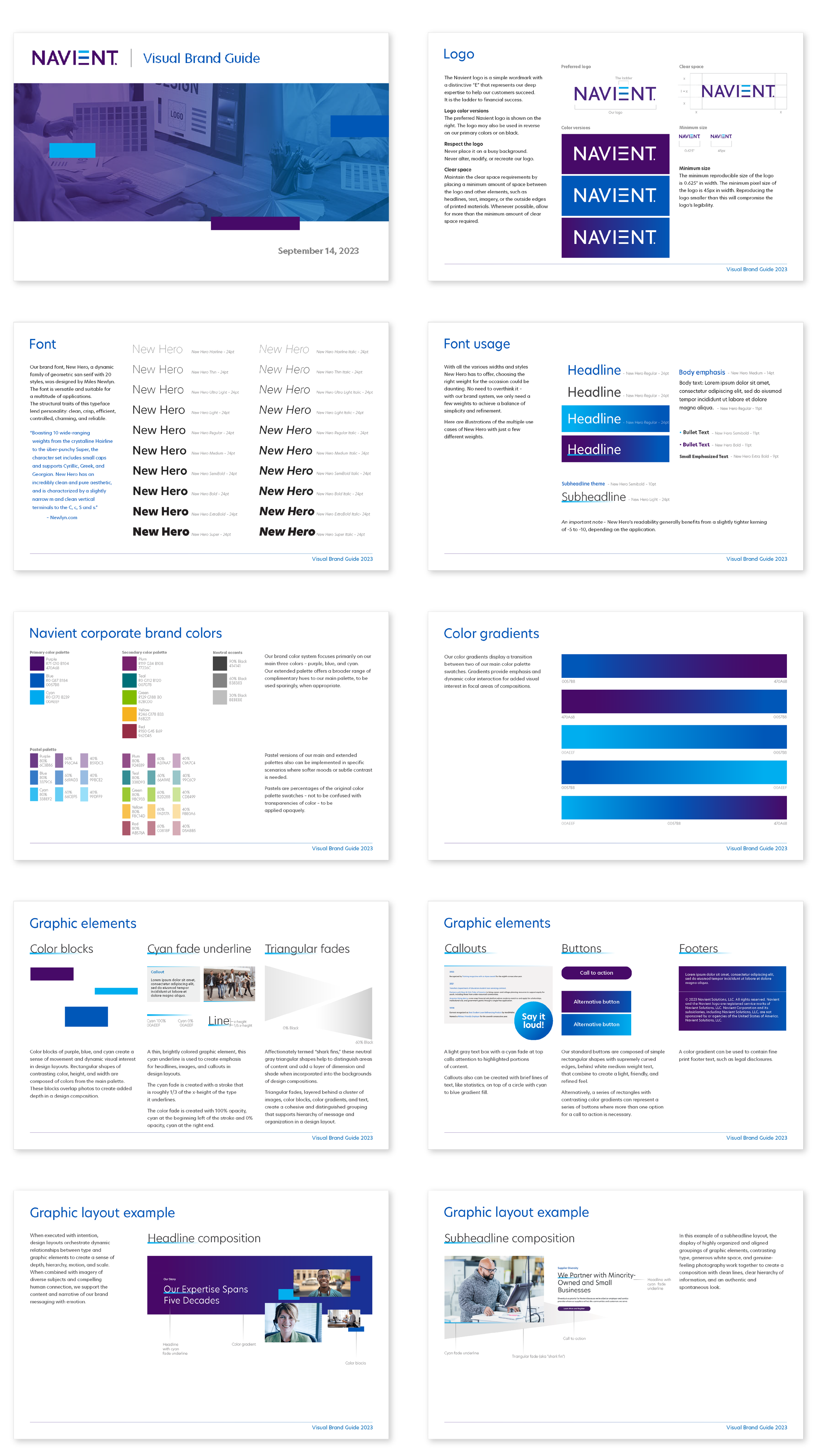 A look of sophistication was achieved with the prominent use of gradient bands, bold color blocks, subtle use of underlines and shadow and a new brand font, New Hero that was implemented across print and web.