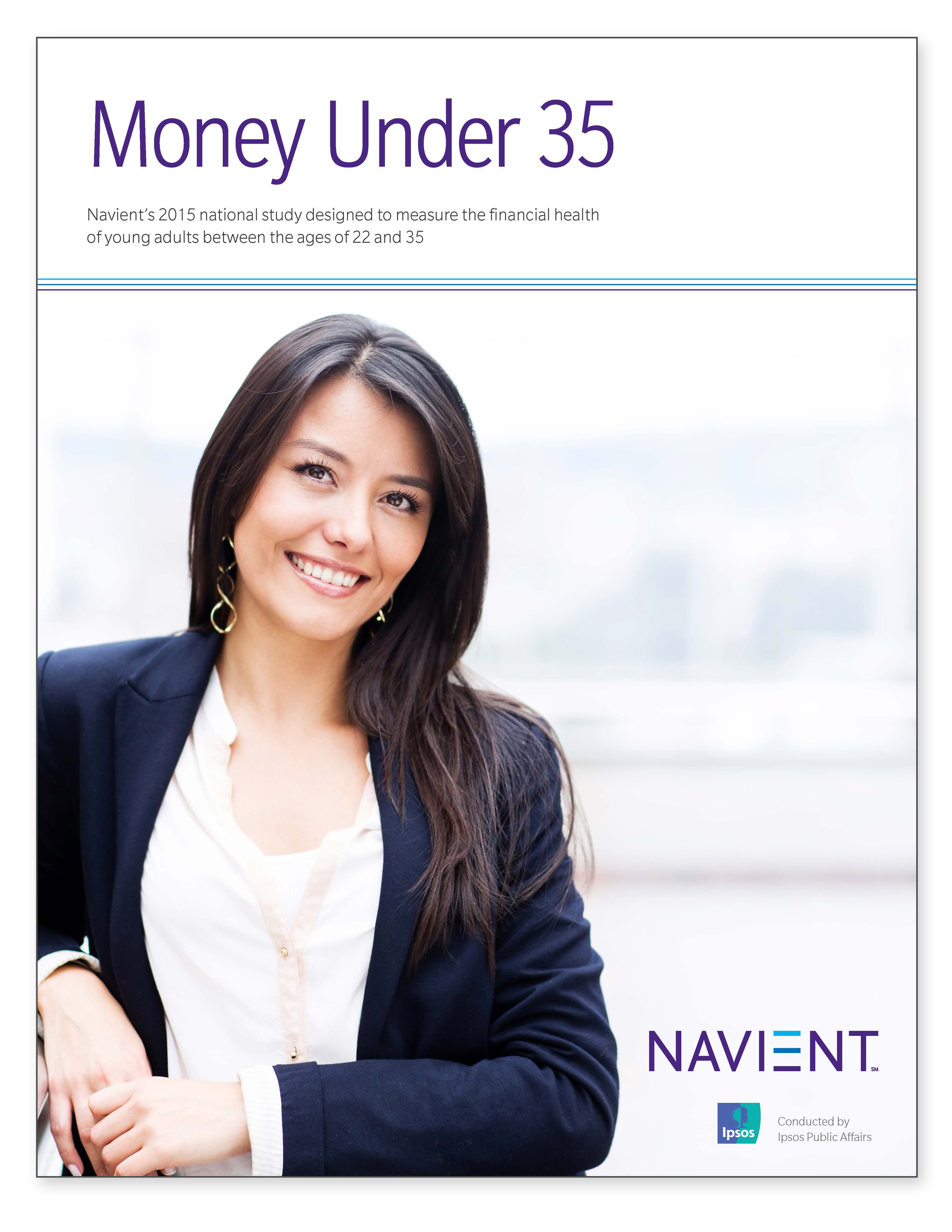 Cover page of a report titled 'Money Under 35' by Navient, depicting a young woman smiling, wearing a dark blazer and a light blouse. The report focuses on the financial health of young adults aged 22 to 35, conducted by Ipsos Public Affairs.