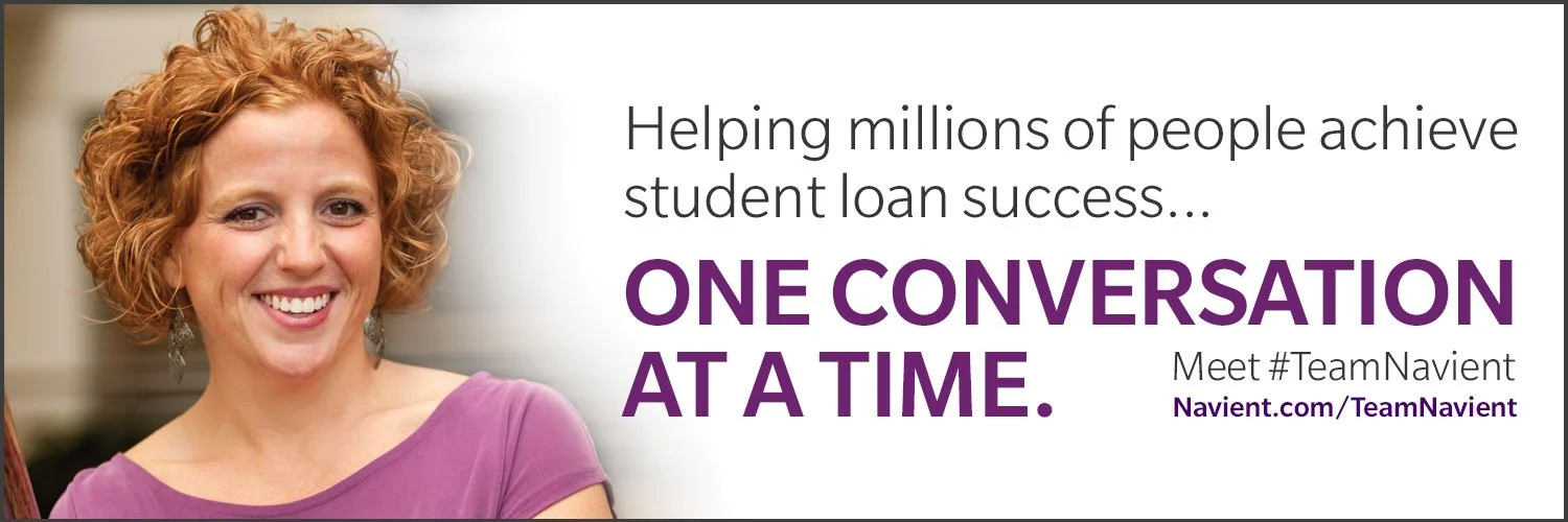A graphic of a web banner ad with a smiling woman with curly hair, promoting Navient's student loan assistance. Text: 'Helping millions of people achieve student loan success... One conversation at a time. Meet #TeamNavient.'