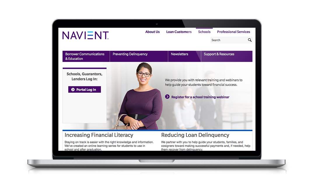 Laptop displaying Navient website with sections for borrower communications, preventing delinquency, newsletters, and support resources. Includes login portal and information on financial literacy and reducing loan delinquency.